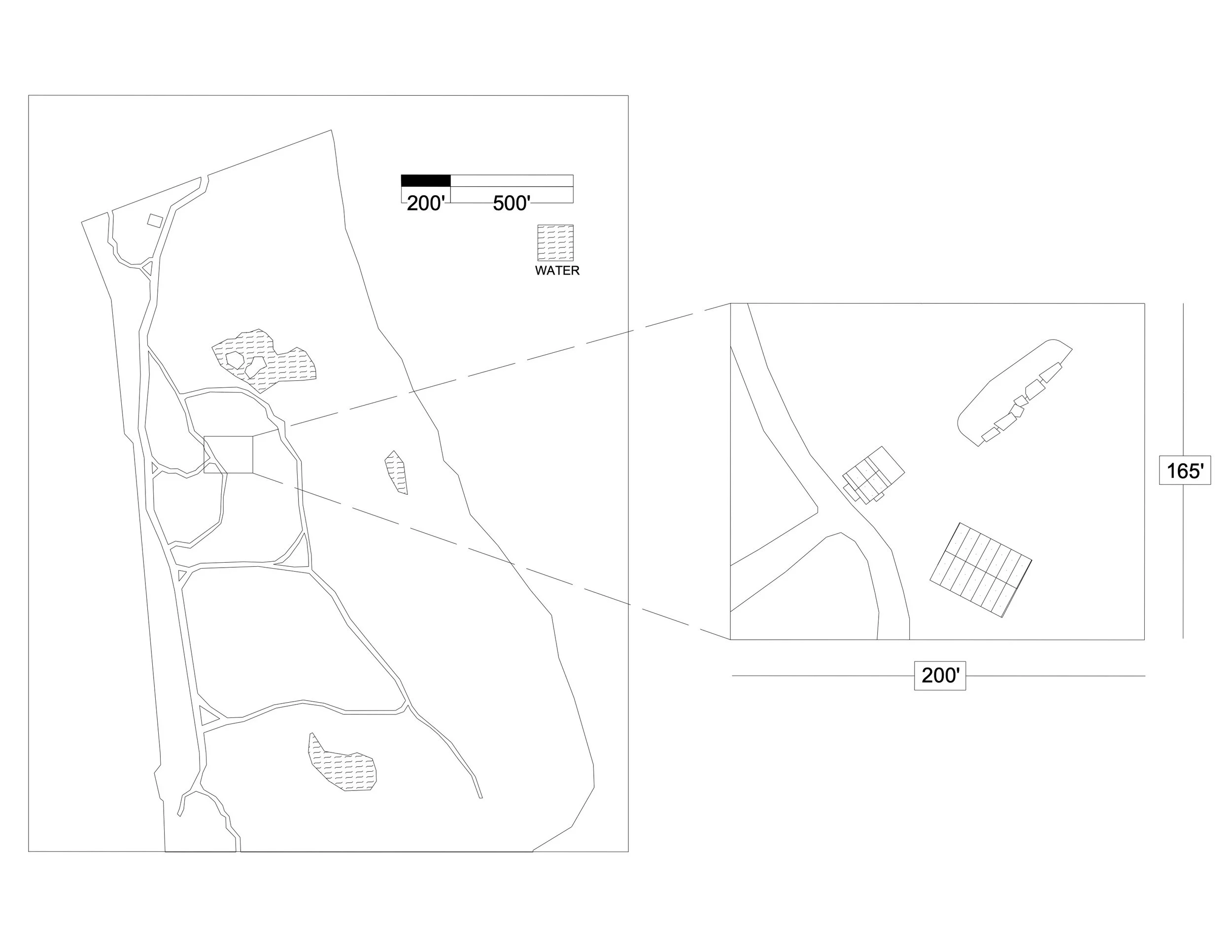 Basic map of the pathways across my great-grandfather’s cattle ranch outside of Austin, Texas. The enlargement shows the layout of the cabins he built, as well as the stone monument he erected directly nearby.